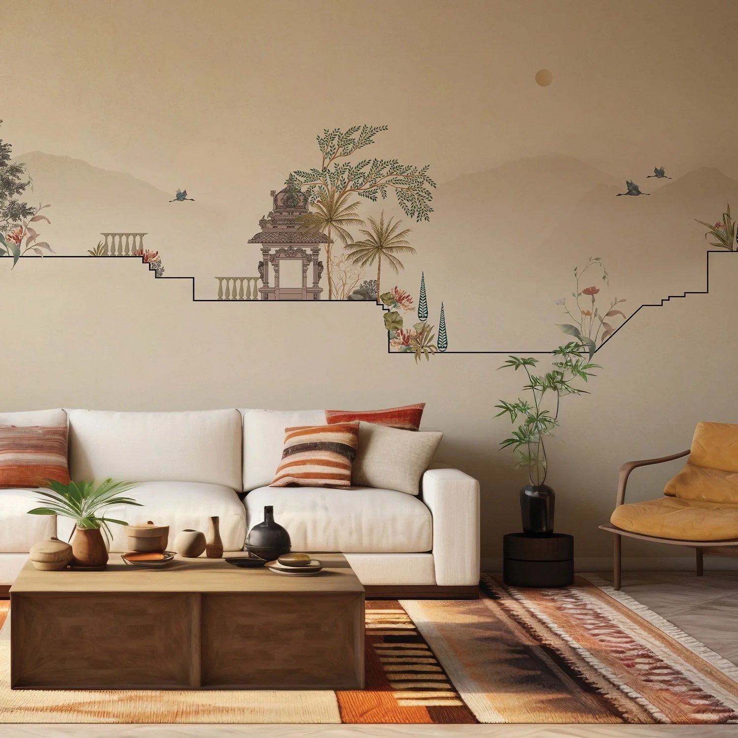 Like a quiet promenade through layered terraces, Level Up Architecture reveals a dialogue between form and nature. Stepped lines trace an architectural rhythm, guiding the eye across palms, florals, and a timeless pavilion set against a softened horizon.