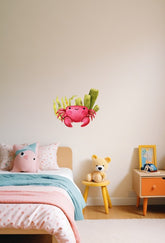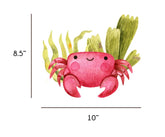 This decal features a watercolor illustration of a pink crab with a happy facial expression, surrounded by green aquatic plants.