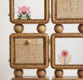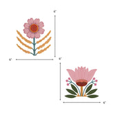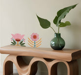The top decal depicts a flower with pink petals and a yellow center, above three pairs of leaves with a wavy pattern, all on a stem. The bottom decal shows a flower with pink petals and green leaves, some of which have white accents, surrounding a brown center.
